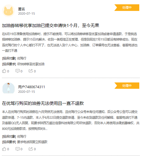 “优驾行加油券不能使用,而且还找不到电子券了,自然也无法平移到他所谓其他平台上或退款,怀疑对方资金链断了,希望平台能还钱或能保证券正常使用。”消费者“用户7479564142”在7月10日向新浪网黑猫投诉平台反映。