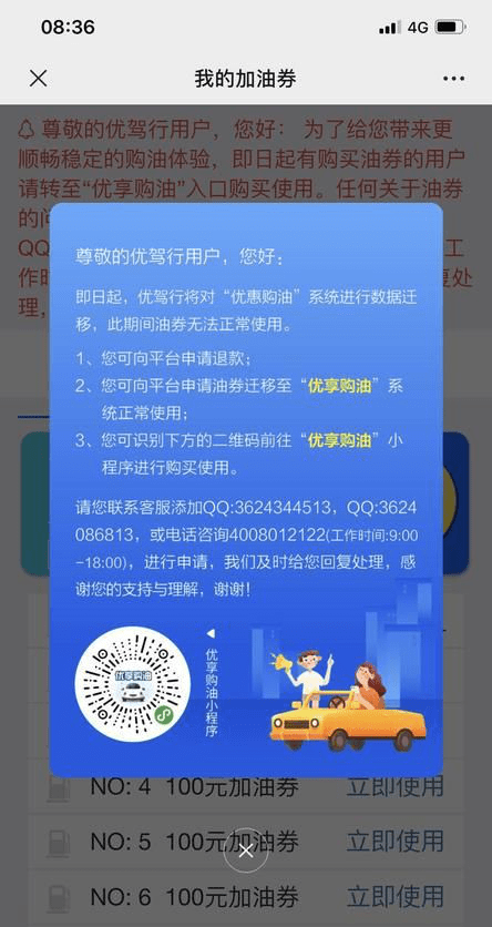 经消费者导报记者调查,以上用户反映的情况确实存在。目前,在“优驾行”平台上尝试使用购买的优惠券时,平台界面显示“为实现有关部门关于‘互联网成品油销售须实名制’的相关要求。即日起优驾行将对‘优惠购油’系统进行数据迁移,此期间油券无法正常使用。”同时给予用户两项选择:“您可向平台申请退款,或向平台申请油券迁移至‘优享购油’正常使用。请您联系客服或电话咨询进行申请。”