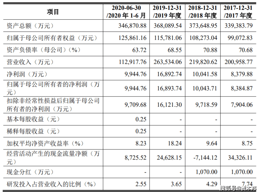 根据招股书显示,2017年至2020上半年,金鹰重工实现营收分别为20.10亿元、21.98亿元、26.35亿元、11.29亿元;实现归母净利润分别为8384.87万元、1亿元、1.69亿元、9944.76万元。