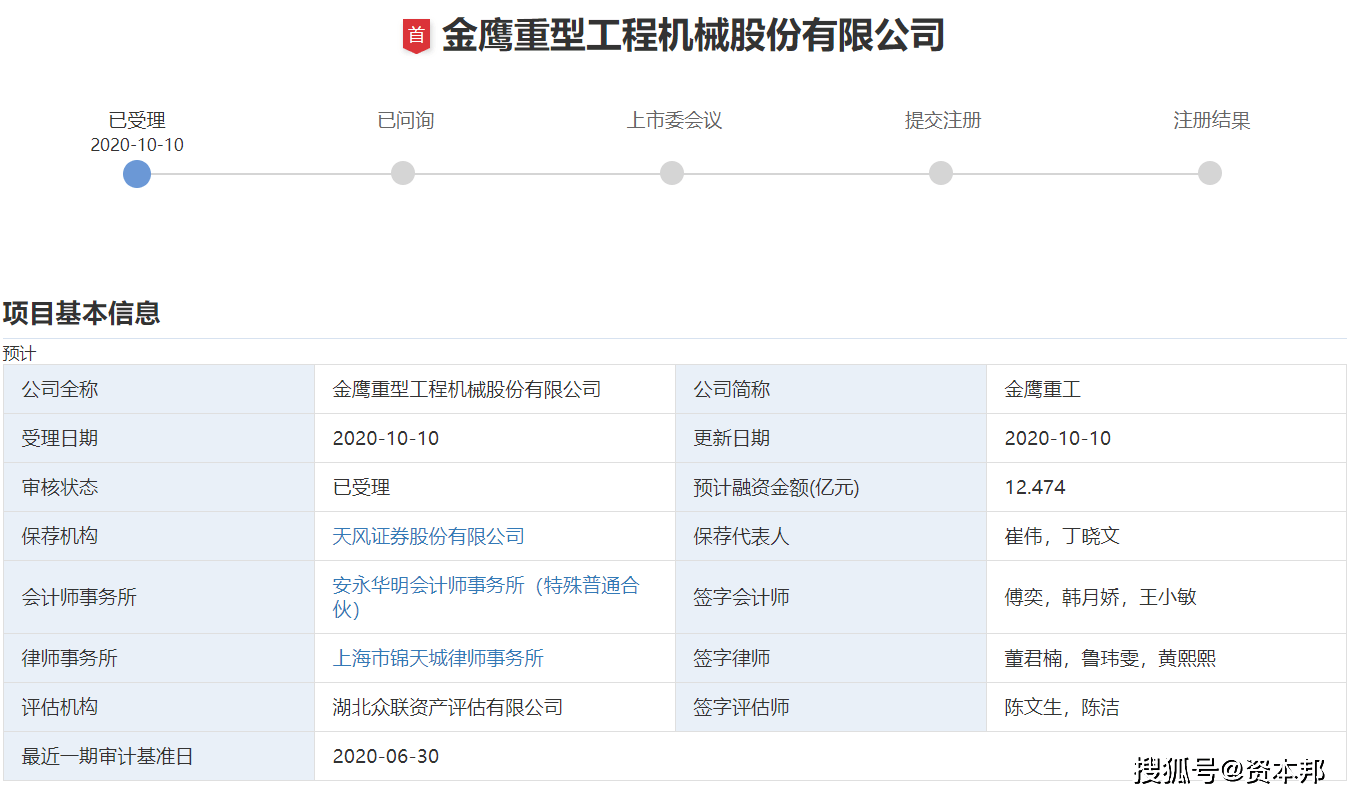 资本邦获悉,金鹰重型工程机械股份有限公司(下称:金鹰重工)的创业板IPO申请已于10月10日获深交所受理,保荐机构为天风证券。