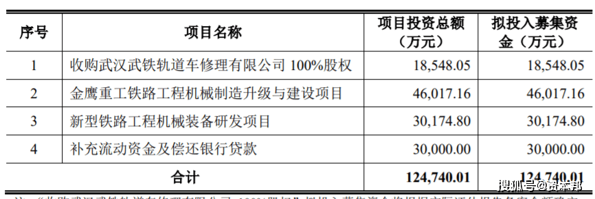 金鹰重工此次公开发行不超过1.33亿股股票,占发行后总股本不低于25.00%,拟募集资金总额不超过12.47亿元,募集资金后拟用于:收购武汉武铁轨道车修理有限公司100%股权、金鹰重工铁路工程机械制造升级与建设项目、新型铁路工程机械装备研发项目、补充流动资金及偿还银行贷款。