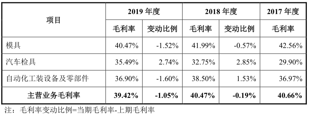 超达装备主营业务以模具为核心,以汽车检具和自动化工装设备及零部件为延伸,模具、检具、自动化工装设备及零部件构成了该公司主营业务的“一体两翼”。毛利率方面,超达装备的主营业务毛利率一直处于下行趋势。据招股书显示,报告期内,该公司主营业务毛利率分别为40.66%、40.47%和39.42%。