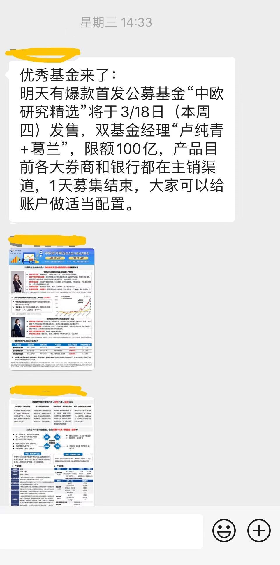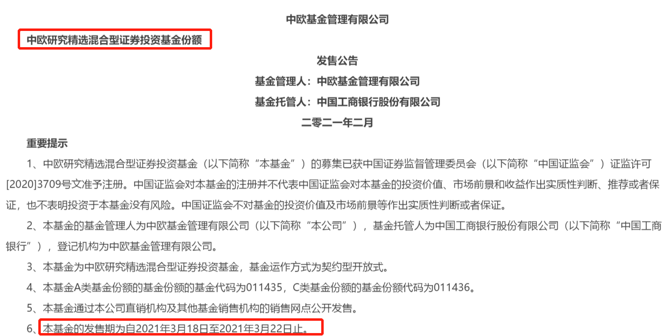 3月18日,拟由卢纯青和葛兰共同搭档管理的中欧研究精选开始发售,公告显示发售期为2021年3月18日至3月22日,合计5天,然而,记者注意到渠道在3月17日对外宣传时称其为“爆款首发”、“1天募集结束”,事实却是,截至3月19日,该基金仍在发行,且未达到渠道所说的百亿募集目标。