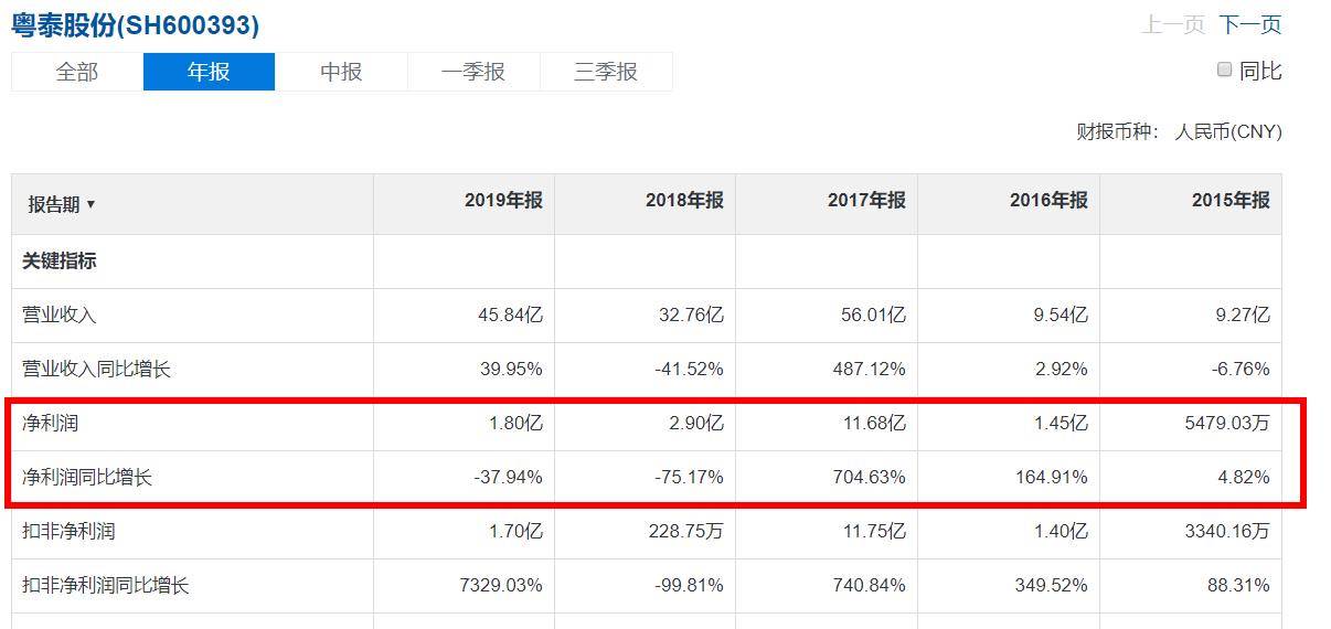 事实上,粤泰股份的业绩大起大落,且从2018年开始步入下降通道。财报数据显示,2015年粤泰股份的净利润为5479.03万元,同比增长4.82%;到2017年净利润已达到11.68亿元,同比暴增到704.63%。但2018年净利润急速下滑到2.90亿元,同比大跌75.17%,2019年则继续下跌,净利润同比下降-37.94%。