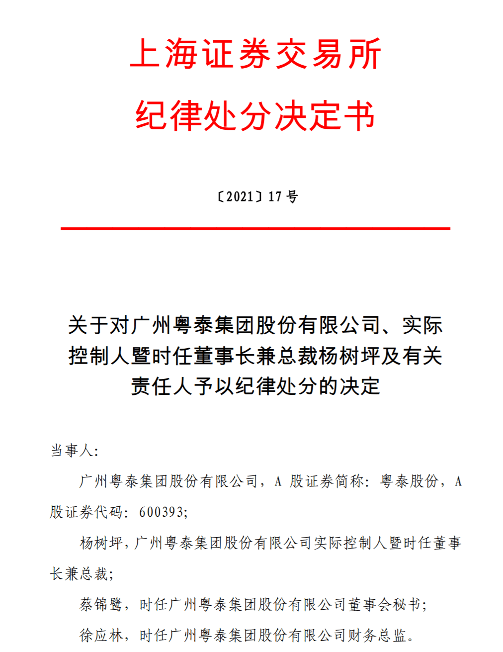 3月12日,粤泰股份际控制人暨时任董事长兼总裁杨树坪因在股票买卖、信息披露方面存在多项违规行为,被上交所予以公开谴责。