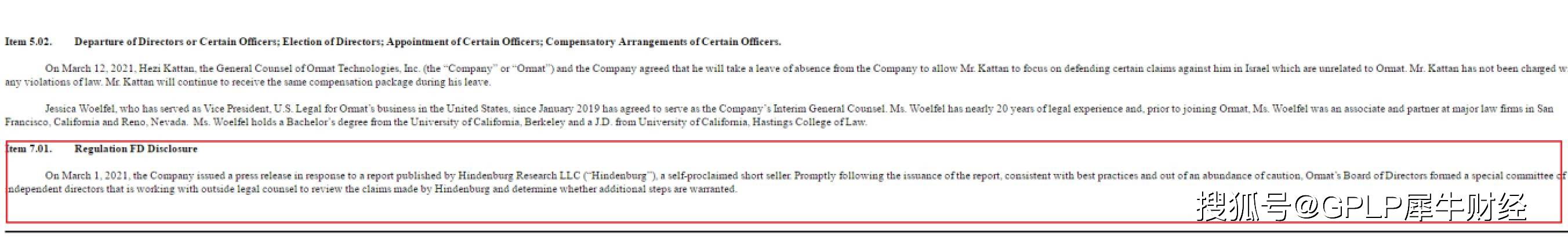 2021年3月1日,奥玛特发布新闻稿,回应自称做空机构Hindenburg Research 发表的报告。奥玛特表示,在做空报告发布后,Ormat董事会迅速组建了一个由独立董事组成的特别委员会,该委员会正在与外部法律顾问合作,审查Hindenburg提出的指控,并确定是否需要采取更多步骤。