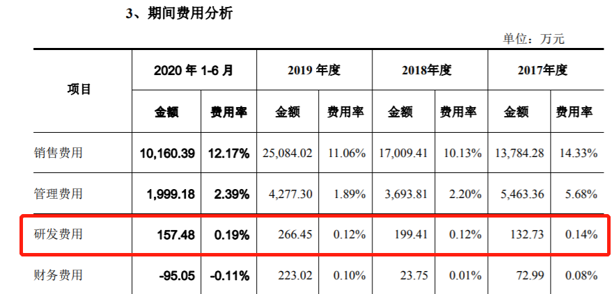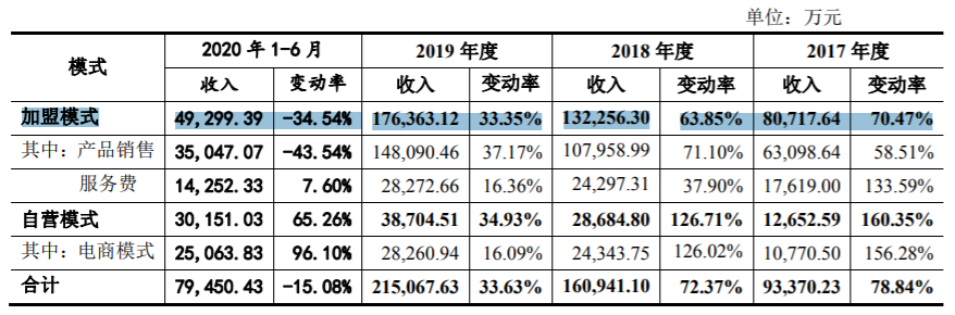 2020年上半年,在疫情暴发的情况下,公司加盟店减少了21家,加盟收入也同比下滑34.54%。对此,其在招股书中也提示风险称,一旦加盟店无法续约,公司在渠道布局上将出现明显缺口,无法及时应对。