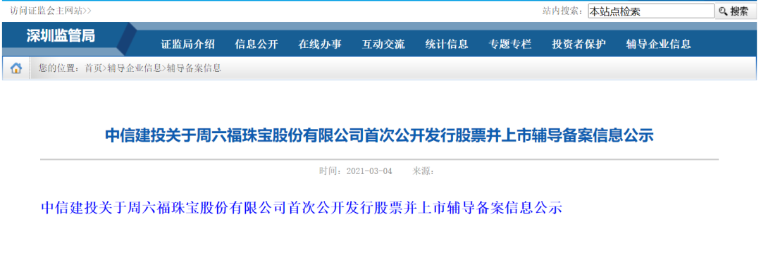 3月4日,深圳证监局官网披露,周六福珠宝股份有限公司已接受中信建投的辅导,并于2021年2月25日在深圳证监局进行了辅导备案。