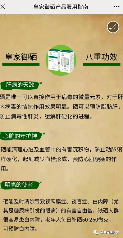 更何况再说回产品本身,官方公众号“皇家御硒”曾在其制作的H5中,则明确写出了皇家御硒所具有的八重功效:肝病的天敌、心脏的守护神、明亮的使者、天然解读剂等。