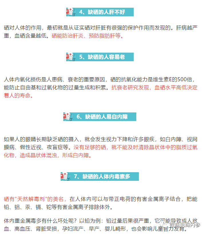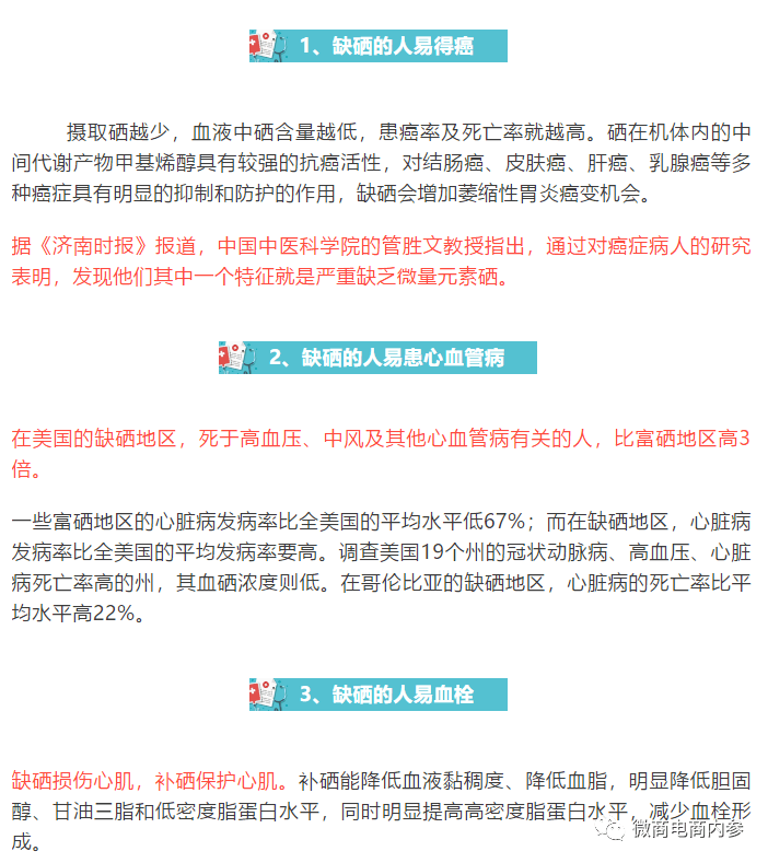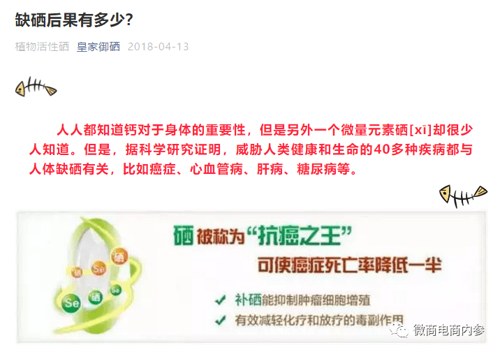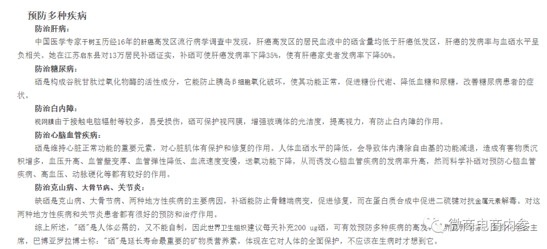 然而,皇家御硒的官网和官方公众号却屡屡晒出硒能治疗百病的资料,这些材料甚至还有些危言耸听的意味:“硒有抗癌作用,当硒缺乏的时候,就很容易导致人体免疫能力下降,威胁人类健康和生命的四十多种疾病都与人体缺硒有关,如癌症、心血管病、肝病、白内障、胰脏疾病、糖尿病、生殖系统疾病等症状。普通人缺硒,身体患肿瘤的机率大大增加,体内缺硒的肿瘤患者多有远处转移、多发性肿瘤、肿瘤分化不良、恶性程度高及生存期短的可能;在与肿瘤的对抗中,硒具有举足轻重的作用。”