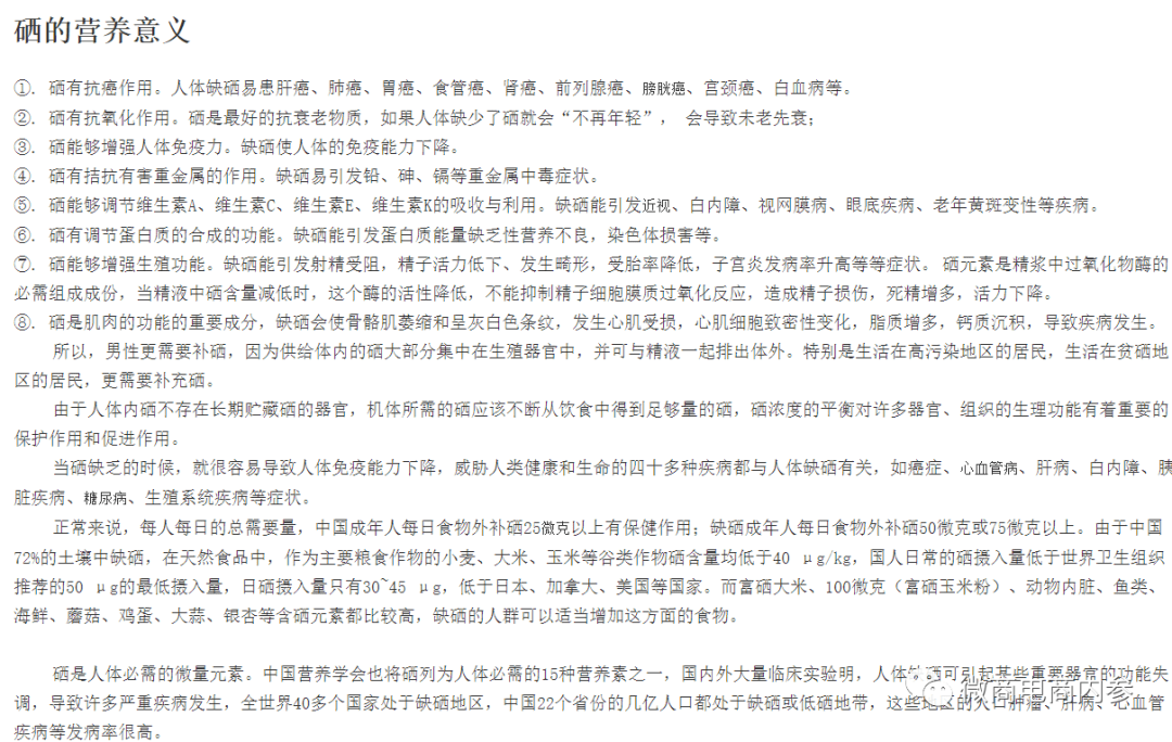 最后说说硒,就算硒确实对人体健康有帮助,是必备元素,但真的人人都需要补硒吗?在2018年,《广州日报》就对此发表了一篇文章,文章指出:硒是否有那么强大的抗癌功效,目前研究结果尚未达成一致,有的研究结果表明硒能降低某些癌症的发病率,有的研究结果却否定了这种结论。所以,硒能抗癌的科学研究证据还很有限。