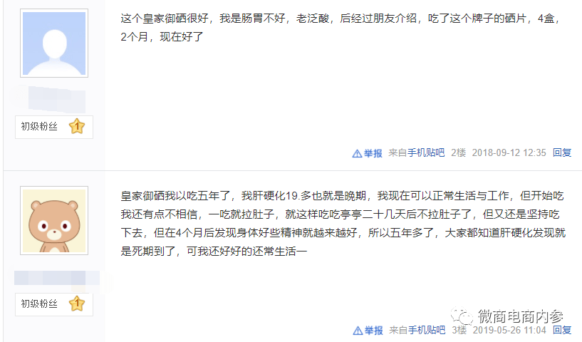 在过去这些年间,在贴吧等平台上,曾出现过不少为皇家御硒系列产品的治病功效佐证的案例。有网友表示:“这个皇家御硒很好,我是肠胃不好,老泛酸,后经过朋友介绍,吃了这个牌子的硒片,4盒,2个月,现在好了”,还有网友回复称:“皇家御硒我已吃五年了,我肝硬化晩期了,但我现在可以正常生活与工作,开始吃我还有点不相信,一吃就拉肚子,就这样吃吃停停二十几天后不拉肚子了,便坚持吃下去,在4个月后发现身体好些了,精神也越来越好,所以五年多了,大家都知道肝硬化发现就是死期到了,可我还能好好地正常生活。”