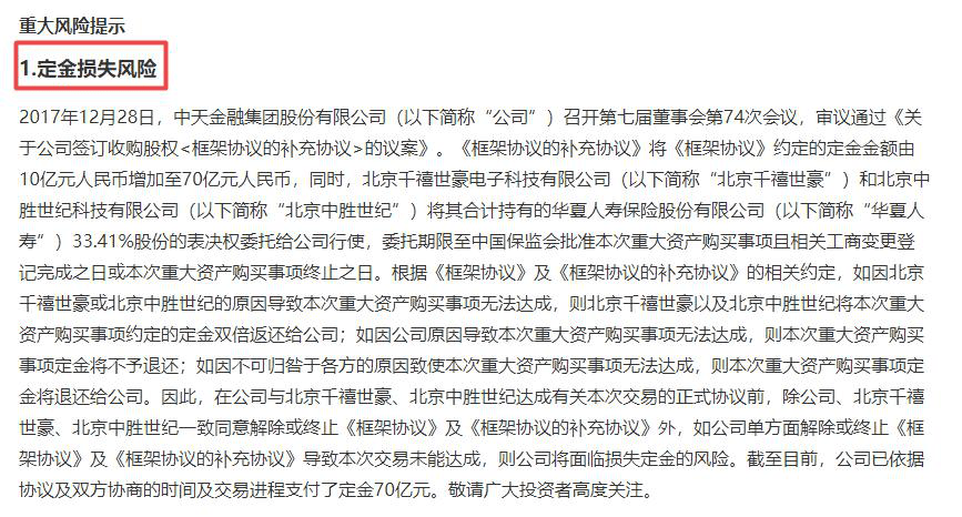 不过,此笔股权交易在这三年期间尚未有进展,不愿承认收购失败事实的中天金融仍坚持按信披规定发布《关于继续推进重大资产重组事项的进展公告》,公告的首个重大风险提示便是定金损失风险,其次是交易事项的不确定性风险。