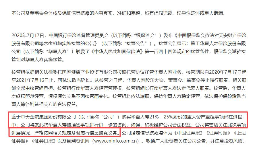 2020年7月17日,银保监会宣布对包括华夏保险在内的9家机构进行接管。当日晚间,中天金融便发布公告称:鉴于中天金融购买华夏人寿21%-25%股份的重大资产重组事项尚在进程中,公司将就此次华夏保险被接管事项进行进一步的咨询、沟通,积极维护公司合法权益,公司将密切关注此次事项进展情况,严格按照相关规定及时履行信息披露义务。