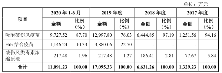 从主营业务来看,欧林生物的营收主要来自于吸附破伤风疫苗和Hib结合疫苗的销售收入。具体来看,2017-2020年上半年吸附破伤风疫苗占总营收的比例分别为94.16%、97.19%、76.03%、87.70%,均在75%以上。由此可见,欧林生物对吸附破伤风疫苗的依赖性较强。