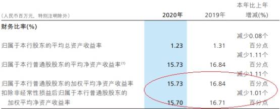 2020年,招商银行归属于本行普通股股东的加权平均净资产收益率为15.73%,比上年同期减少1.11个百分点;扣非后归属于本行普通股股东的加权平均净资产收益率为15.70%,比上年同期减少1.01个百分点。