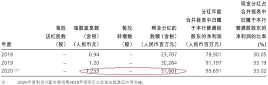 招商银行2020年利润分配方案为,按照经审计的公司2020年度净利润886.74亿元的10%提取法定盈余公积,计88.67亿元;按照风险资产1.5%差额计提一般准备82.47亿元。公司拟以届时实施利润分配股权登记日A股和H股总股本为基数,向登记在册的全体股东派发现金股息,每股现金分红1.253元(含税),以人民币计值和宣布,以人民币向A股股东支付,以港币向H股股东支付。