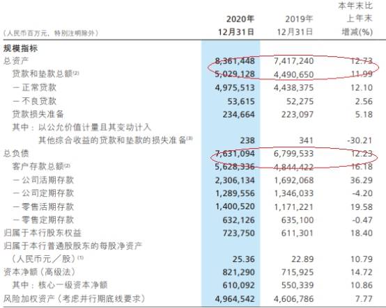 2020年,招商银行总资产为83614.48亿元,比上年末增长12.73%,贷款和垫款总额为50291.28亿元,比上年末增长11.99%;同期,招商银行总负债为76310.94亿元,比上年末增长12.23%,客户存款总额为56283.36亿元,比上年末增长16.18%。