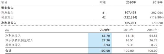 2020年,招商银行净利息收入为1850.31亿元,同比增长6.90%,占营业收入比重63.70%;实现非利息净收入1054.51亿元,同比增长9.15%;利息支出为1223.94亿元,上年同期为1199.04亿元。