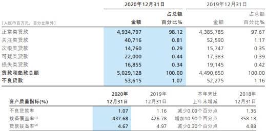 资产质量方面,招商银行不良贷款总额536.15亿元,较上年末增加13.40亿元;不良贷款率1.07%,较上年末下降0.09个百分点 ;拨备覆盖率437.68%,较上年末上升10.90个百分点;贷款拨备率4.67%,较上年末下降0.30个百分点。