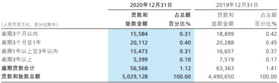 2020年,招商银行逾期贷款565.68亿元,较上年末减少67.95亿元,逾期贷款占比1.12%,较上年末下降0.29个百分点。逾期贷款中,抵质押贷款占比31.97%,保证贷款占比23.25%,信用贷款占比44.78%(主要为信用卡逾期贷款)。