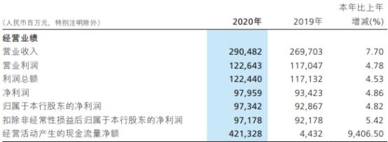 中国经济网北京3月22日讯(记者 蒋柠潞) 招商银行(600036.SH)近日发布2020年度报告,公司去年全年实现营业收入2904.82亿元,同比增长7.70%;实现归属于本行股东的净利润973.42亿元,同比增长4.82%;扣非后归属于本行股东的净利润971.78亿元,同比增长5.42%;经营活动产生的现金流量净额4213.28亿元,去年同期为44.32亿元。