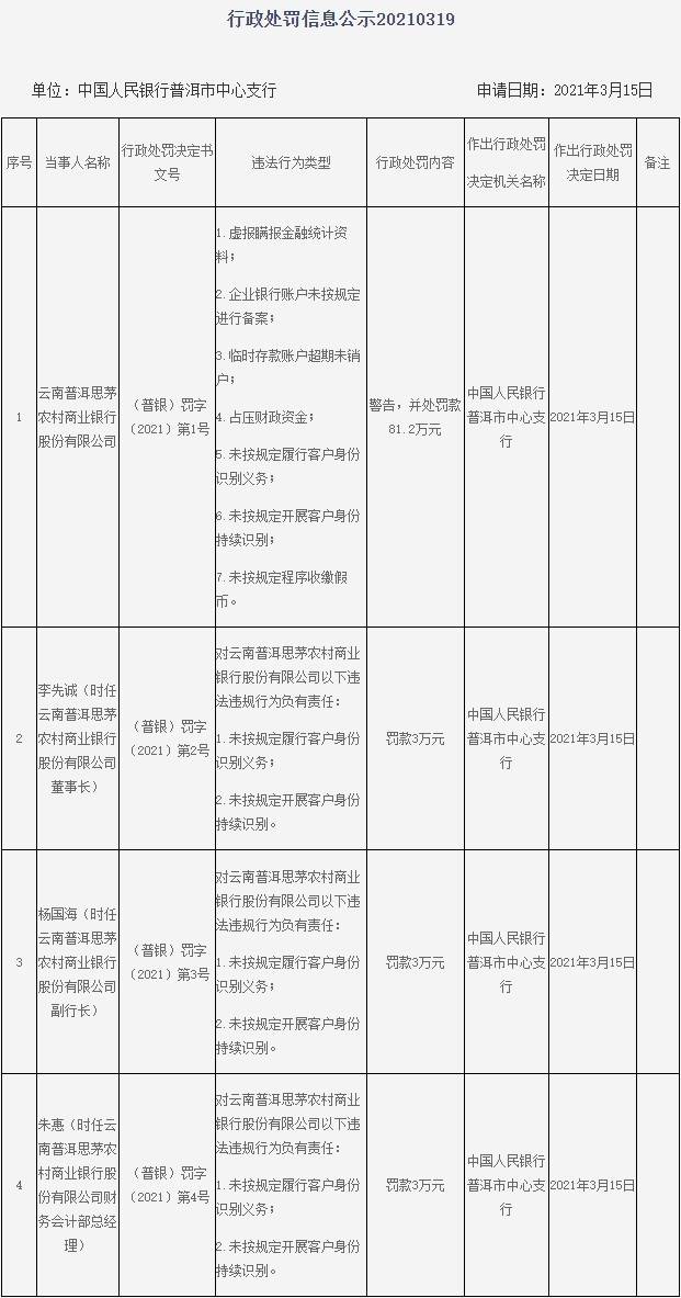 云南普洱思茅农商行7宗违法 董事长李先诚等3人遭罚