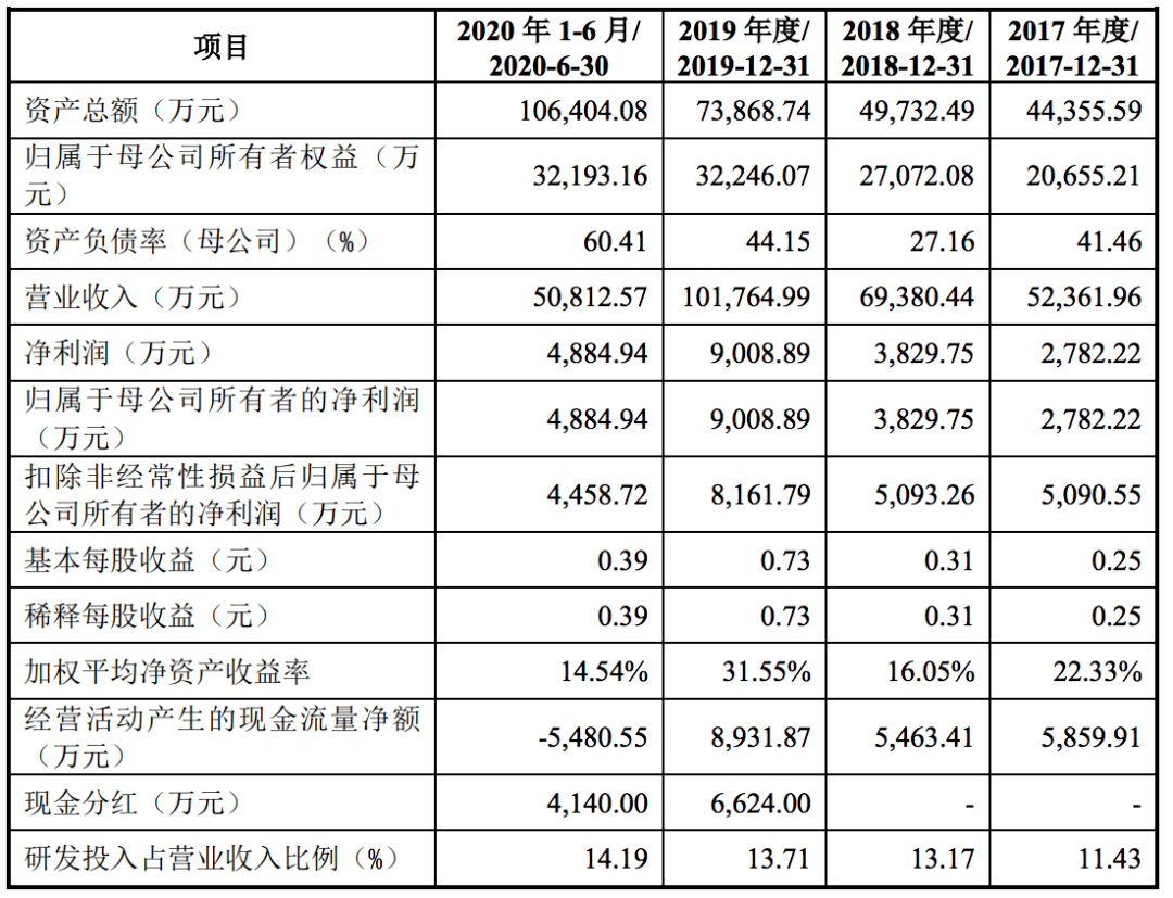 招股书显示,2017年、2018年、2019年与2020年上半年,艾为电子分别实现营收5.24亿元、6.94亿元、10.18亿元与5.08亿元,分别实现净利润2782.22万元、3829.75万元、9008.89万元与4884.94万元,逐年增加。