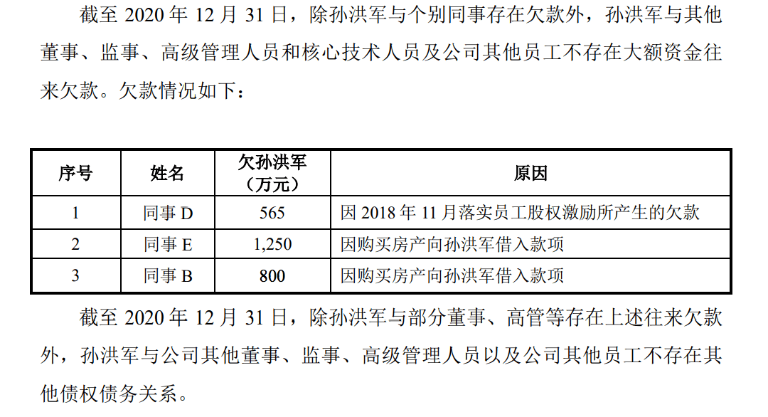 截至2020年12月31日,除孙洪军与个别同事存在欠款外,孙洪军与其他董高监和核心技术人员及公司其他员工不存在大额资金往来欠款。同期,除了存在上述欠款外,孙洪军与公司其他人员不存在其他债权债务关系。