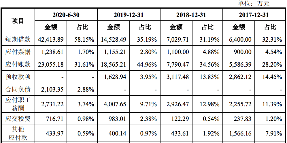 此外,贝多财经了解到,艾为电子公司也存在较高的负债。截至2017年、2018年。2019年与2020年上半年各期期末,艾为电子的短期借款分别为6400.0万元、7029.71万元、1.45亿元与4.24亿元,连年剧增。
