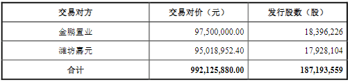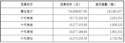 据常宝股份2017年11月17日披露的《发行股份购买资产暨关联交易实施情况报告书暨股份上市公告书》显示,向嘉愈医疗发行1.42亿股股份购买其持有的什邡二院 80%股权、洋河人民医院 65%股权及瑞高投资 77%股份;向什邡康德发行203.25万股股份购买其持有的什邡二院约 4.72%股权;向什邡康盛发行193.91万股股份购买其持有的什邡二院约 4.51%股权;向什邡康强190.14万股发行股份购买其持有的什邡二院约 4.42%股权;向什邡康裕发行273.08万股股份购买其持有的什邡二院约 6.35%股权;向金鹏置业发行1839.62万股股份购买其持有的洋河人民医院 25%股权;向潍坊嘉元发行1792.81万股股份购买其持有的瑞高投资 23%股权。