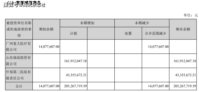年报中显示,鉴于什邡二院、山东瑞高是并购重组时形成的商誉,根据评估报告并综合考虑标的资产的实际经营情况,公司拟对什邡二院和瑞高投资合计形成初始商誉,分别计提0.43亿元、1.62亿元的商誉减值准备,合计计提商誉减值准备2.05亿元。