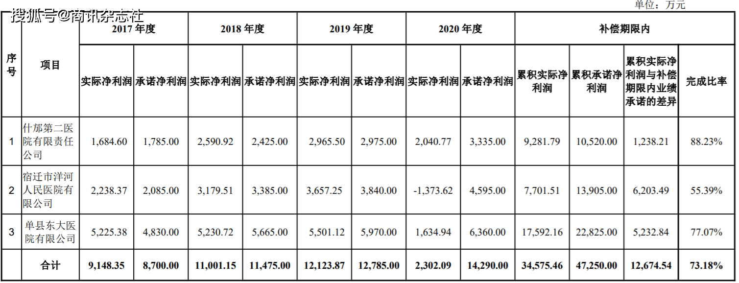 数据显示,当初并购重组时,购买的三家医疗机构的股东承诺,瑞高投资所持有的单县东大医院2017-2020年净利润分别不低于0.48亿元、0.57亿元、0.597亿元和0.64亿元;什邡二院2017-2020年净利润分别不低于0.18亿元、0.24 亿亿元、0.2975亿元和0.3335亿元;洋河医院2017-2020年净利润分别不低于0.2085亿元、0.3385亿元、0.3840亿元和0.4595亿元。