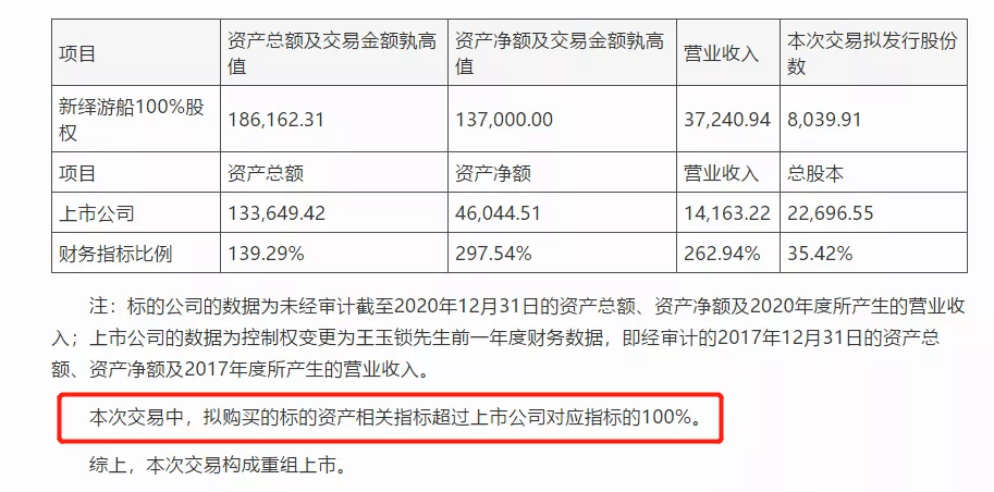 无论是从营收指标、资产总额还是资产净额来看,标的资产明显要优于西藏旅游,本次交易构成重组上市。这也就意味着,新绎游船将借西藏旅游实现借壳上市,而王玉锁作为西藏旅游实际控制人尚未满36个月。