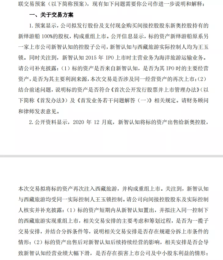 问询函要求说明标的资产是否来自新智认知,是否为其IPO时的主要经营资产,是否为其主要利润来源,本次交易是否涉及同一经营资产的再次上市;标的资产短期内从新智认知置出,并拟注入同一控制下的西藏旅游实现重组上市,相关交易安排的主要考虑和筹划过程,是否为一揽子交易安排,并结合分拆条件等,说明相关交易安排是否存在规避分拆上市条件的情形;标的资产出售后对新智认知后续持续经营的影响等。