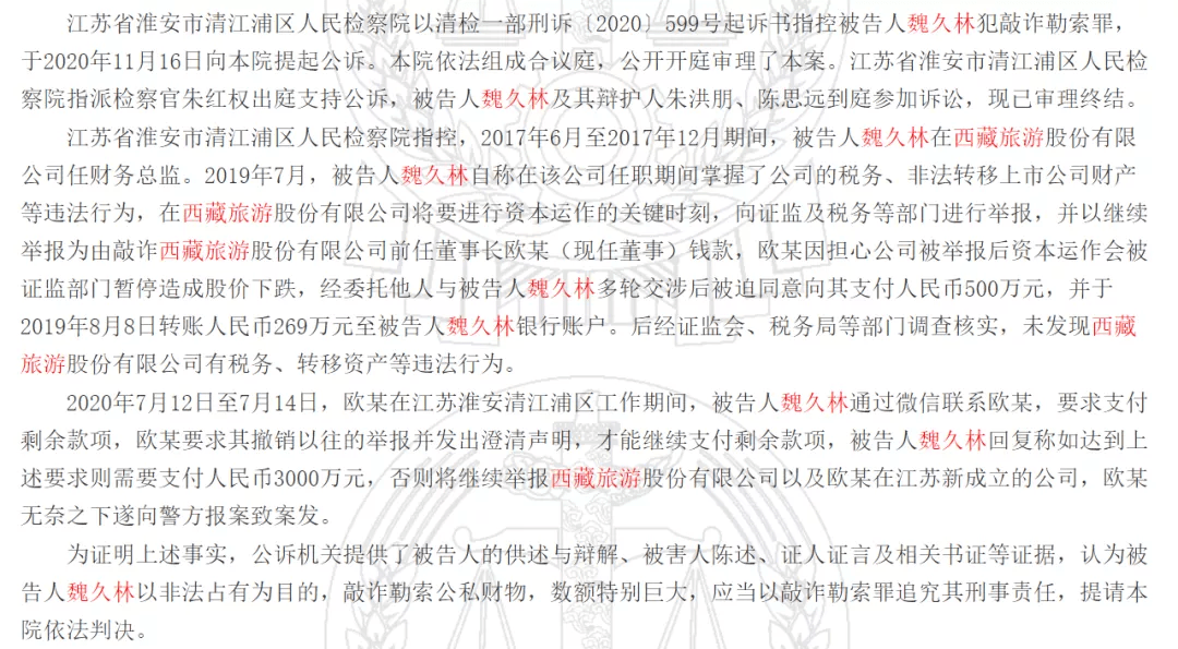 后经证监会、税务局等部门调查核实,未发现西藏旅游股份有限公司有税务、转移资产等违法行为。被告人魏久林被法院判处犯敲诈勒索罪,判处有期徒刑十一年,退还违法所得269万元,并处罚金人民币十万元。
