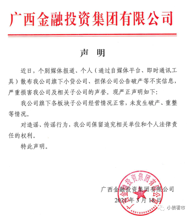 3月18日,广西金投在官网发布声明称,旗下各板块子公司经营情况正常,未发生破产、重整等情况。