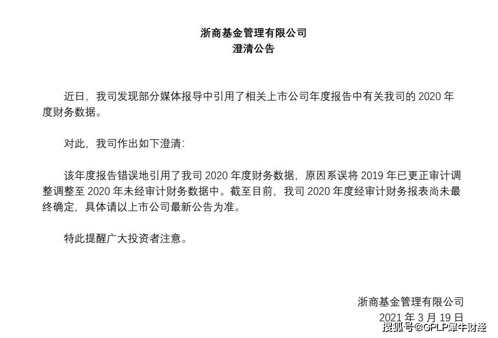 然而,浙商证券发布澄清公告称,上述浙商基金的财务数据失实。3月19日浙商基金发布澄清公告显示,“该年度报告错误地引用了我司2020年度财务数据,原因系误将2019年已更正审计调整调整至2020年未经审计财务数据中。截至目前,我司2020年度经审计财务报表尚未最终确定,具体请以上市公司最新公告为准。”