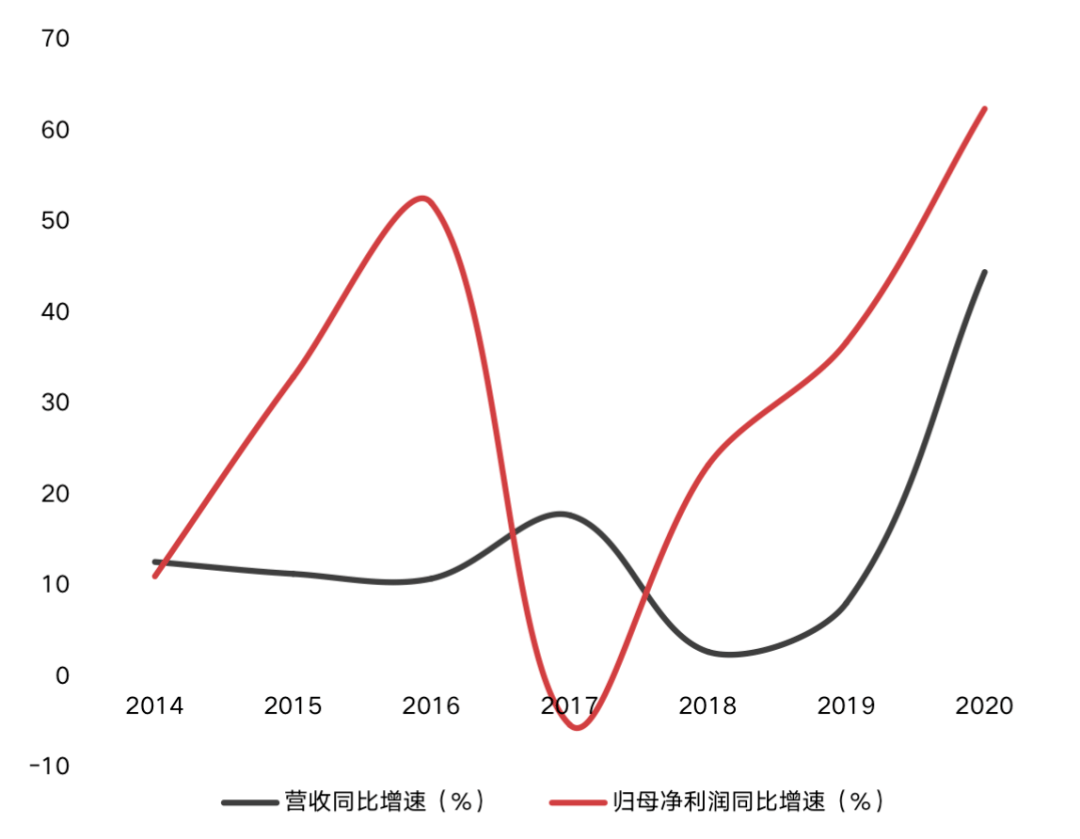 据Wind数据显示,2014年至2020年,其营收同比增速最大值与最小值之间的差额为47.14个百分点,归母净利润同比增速最高点与最低点的差额为67.72个百分点。可以看到,相较于营收同比增速来看,该公司归母净利润同比增速波幅更大,这从一定程度上反映出在营收规模一定的前提下,其盈利的稳健性或许有待提升。
