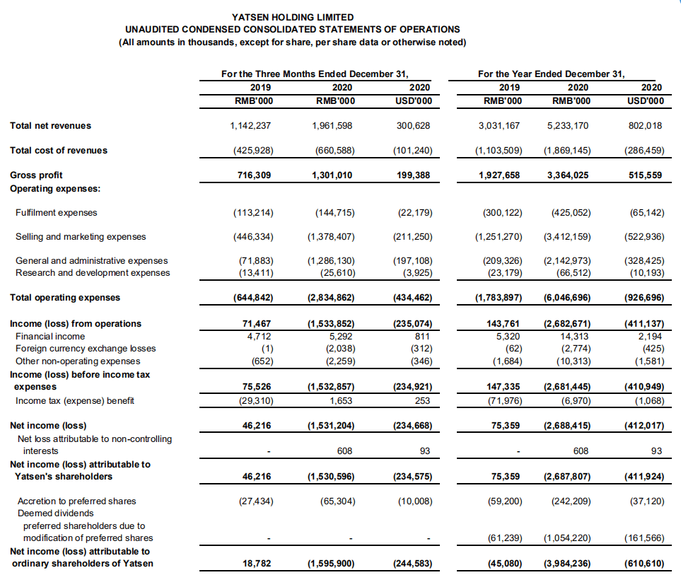 同时,逸仙电商还于近日发布了赴美上市后的首份财报——2020年第四季度及全年未经审计的财务报告。财报显示,该公司全年实现总营收52.3亿元(人民币,下同),同比增长72.65%;其中第四季度实现营业收入19.62亿元,同比增长71.7%。
