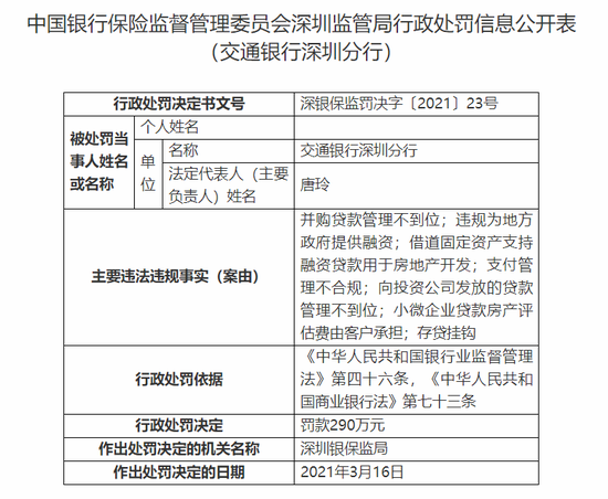 3月23日消息,深圳银保监局公布的行政处罚信息公开表显示,交通银行深圳分行因并购贷款管理不到位;违规为地方政府提供融资;借道固定资产支持融资贷款用于房地产开发;支付管理不合规;向投资公司发放的贷款管理不到位;小微企业贷款房产评估费由客户承担;存贷挂钩,被处罚款290万元。