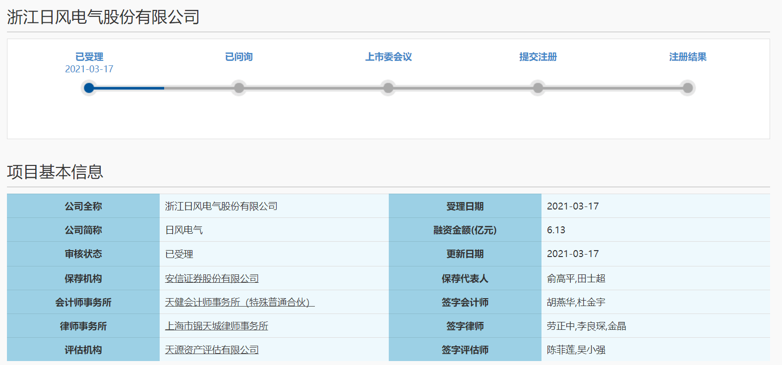 3月17日晚间,浙江日风电气股份有限公司(下称“日风电气”)科创板IPO获上交所受理,拟发行不超过4000万股,募资6.13亿元。