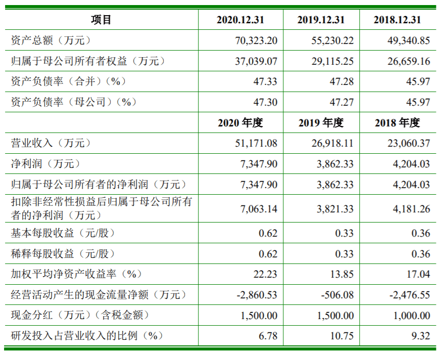 财务数据显示,日风电气2018年、2019年、2020年营收分别为2.31亿元、2.69亿元、5.12亿元;同期对应的净利润分别为4,204.03万元、3,862.33万元、7,347.90万元,同期,研发投入占营收比例分别为9.32%、10.75%、6.78%。