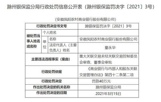 3月23日消息,滁州银保监分局公布的行政处罚信息公开表显示,安徽凤阳农村商业银行股份有限公司因重大关联交易未经关联交易控制委员会审查、董事会审批,被处罚款40万元。