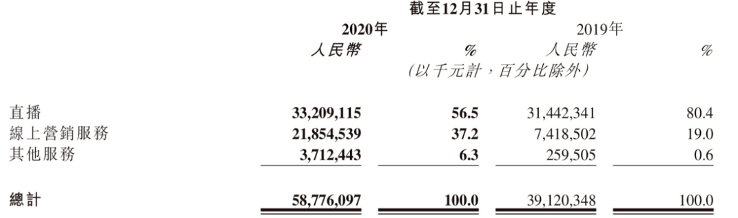 与此同时,快手营销服务业务涨势明显。2020年,快手该业务收入高达219亿元,较2019年的74亿元大涨195%,在总营收中的比重也由19%上升至37.2%。快手在财报中称,2020年推出的综合线上营销平台,品牌广告、联盟广告等新形势以及定制化的广告内容,带来了线上营销业务的增长。