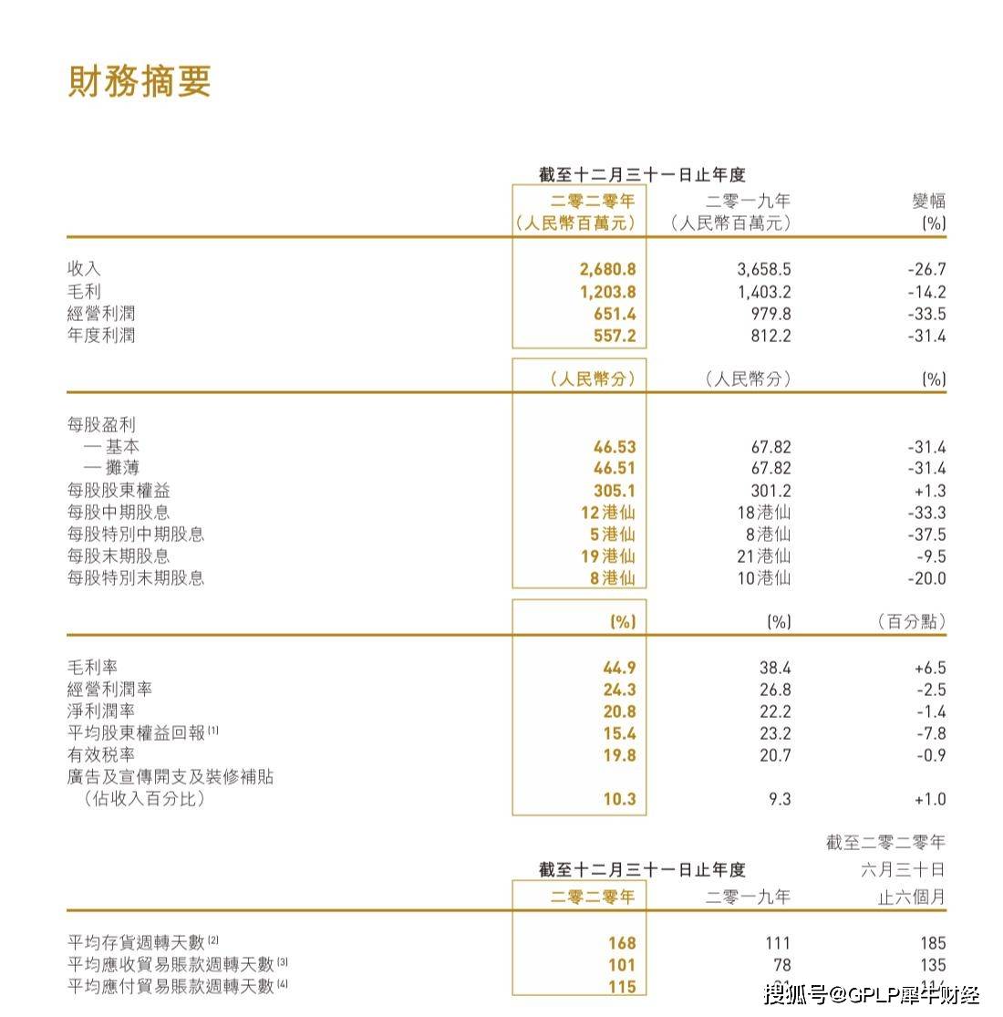 3月18日,中国利郎(01234.HK)发布业绩公告表示,2020年度,实现收入26.80亿元,同比下降26.7%;实现年度利润5.57亿元,同比下降31.4%;实现毛利12.04亿元,同比下降14.2%;实现经营利润6.51亿元,同比下降33.5%。
