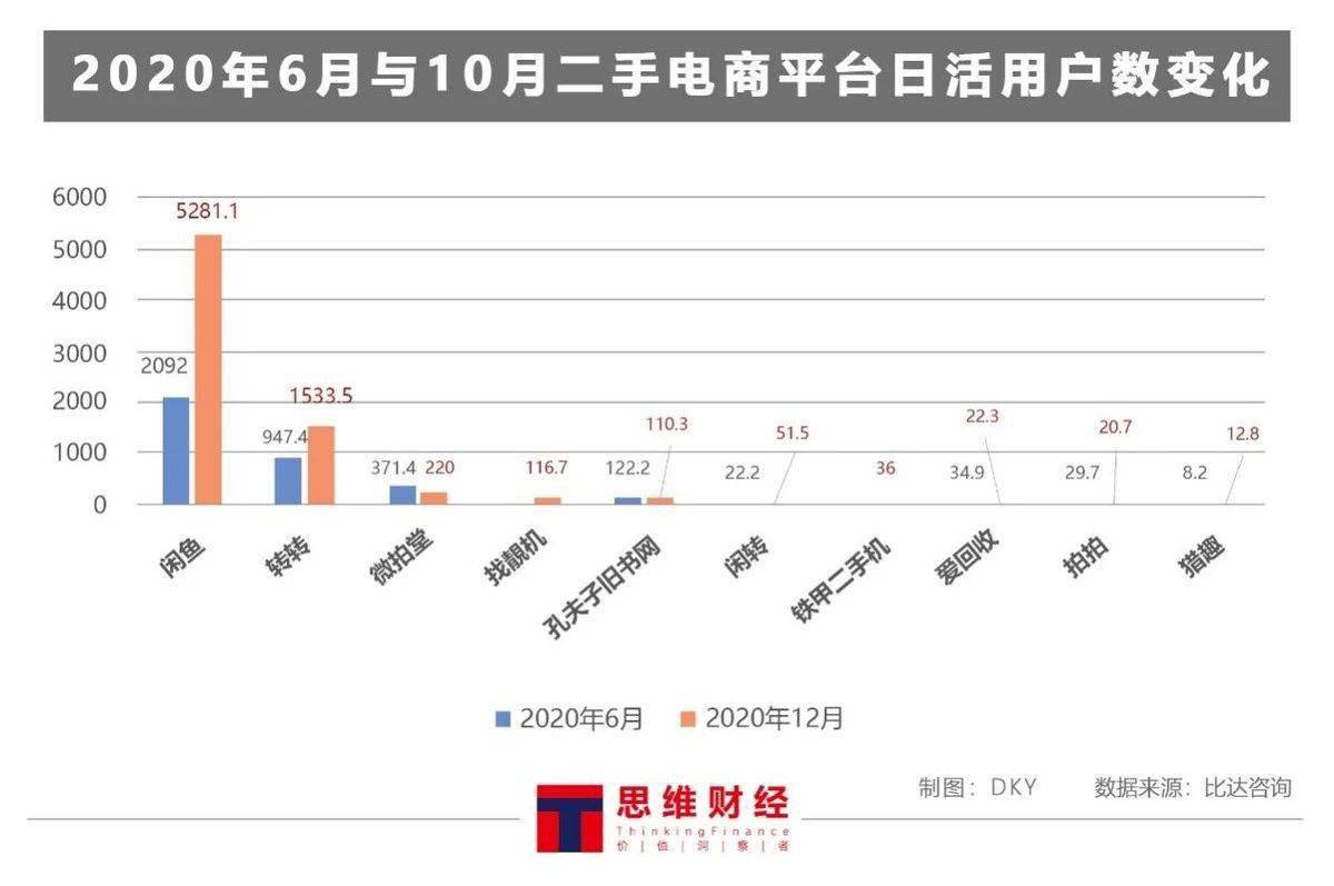 这种梦幻联动理应发挥出不错的效果,然而现实似乎没有这么美好。据比达咨询统计的数据显示,淘宝推出的闲鱼和有腾讯背景的转转已经稳稳占据二手电商行业的前两名,二者的日活用户均已达到千万级。从2020年6月到10月,仅仅三个月时间,闲鱼的日活用户增长超过150%,转转增长了约61.92%