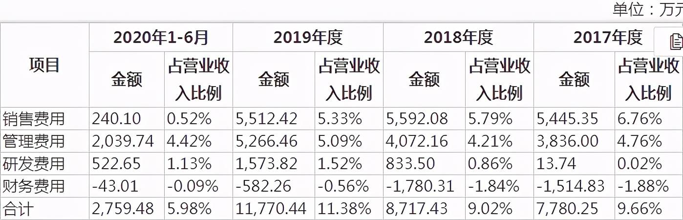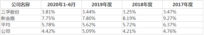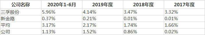 2017-2020年上半年,华融化学的管理费用率分别为4.76%、4.21%、5.09%和4.42%,也同样低于同期同行业上市公司管理费用率均值,即6.37%、5.72%、5.62%和5.78%。