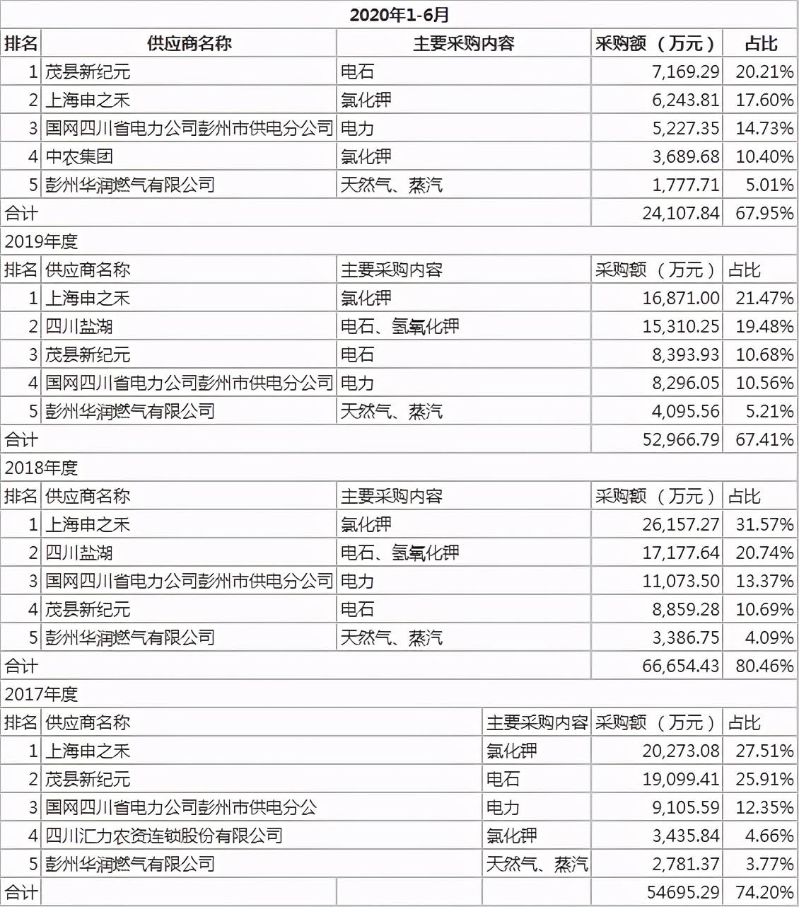 招股书显示,2017-2020年上半年,华融化学对前五大供应商的采购金额合计分别为5.47亿元、6.67亿元、5.30亿元和2.41亿元,占当期采购总额的比例分别为74.21%、80.46%、67.41%和67.95%,前五大供应商占比过半,采购集中度较高。