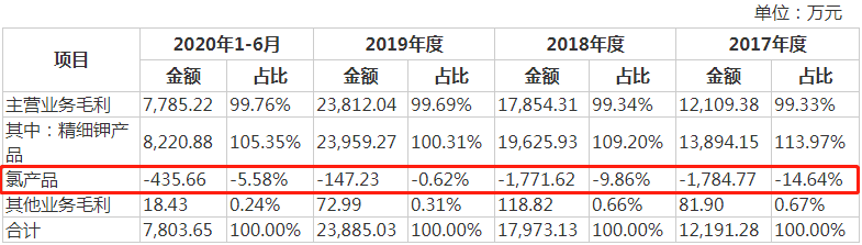 发现网记者还发现,2017-2020年上半年,华融化学的精细钾产品的毛利分别为1.39亿元、1.96亿元、2.40亿元和8220.88万元,贡献的毛利占比分别为113.97%、109.20%、100.31%和105.35%,是其主要盈利来源,而氢氧化钾作为公司的核心产品,贡献了公司主营业务毛利最主要的组成部分。